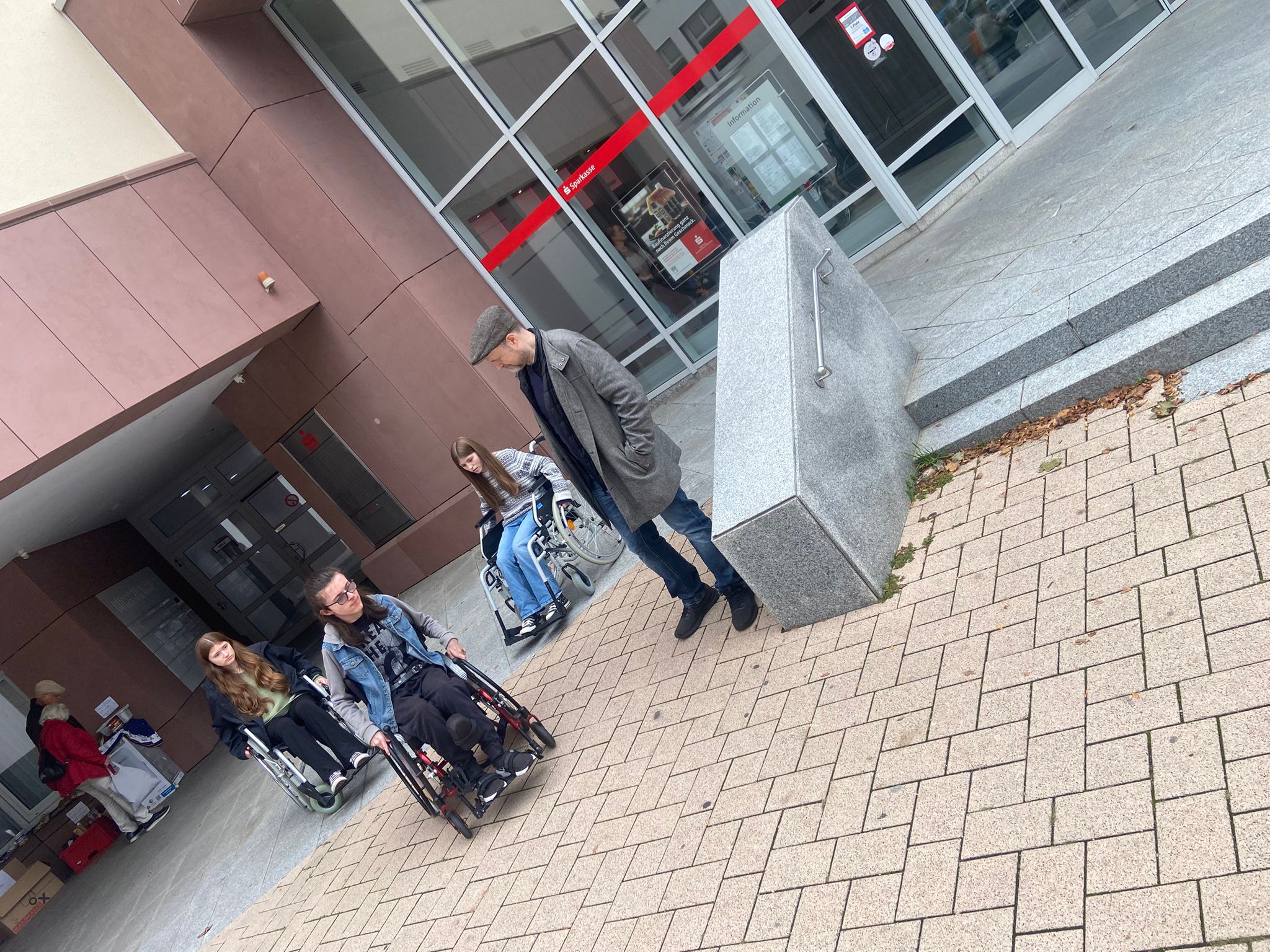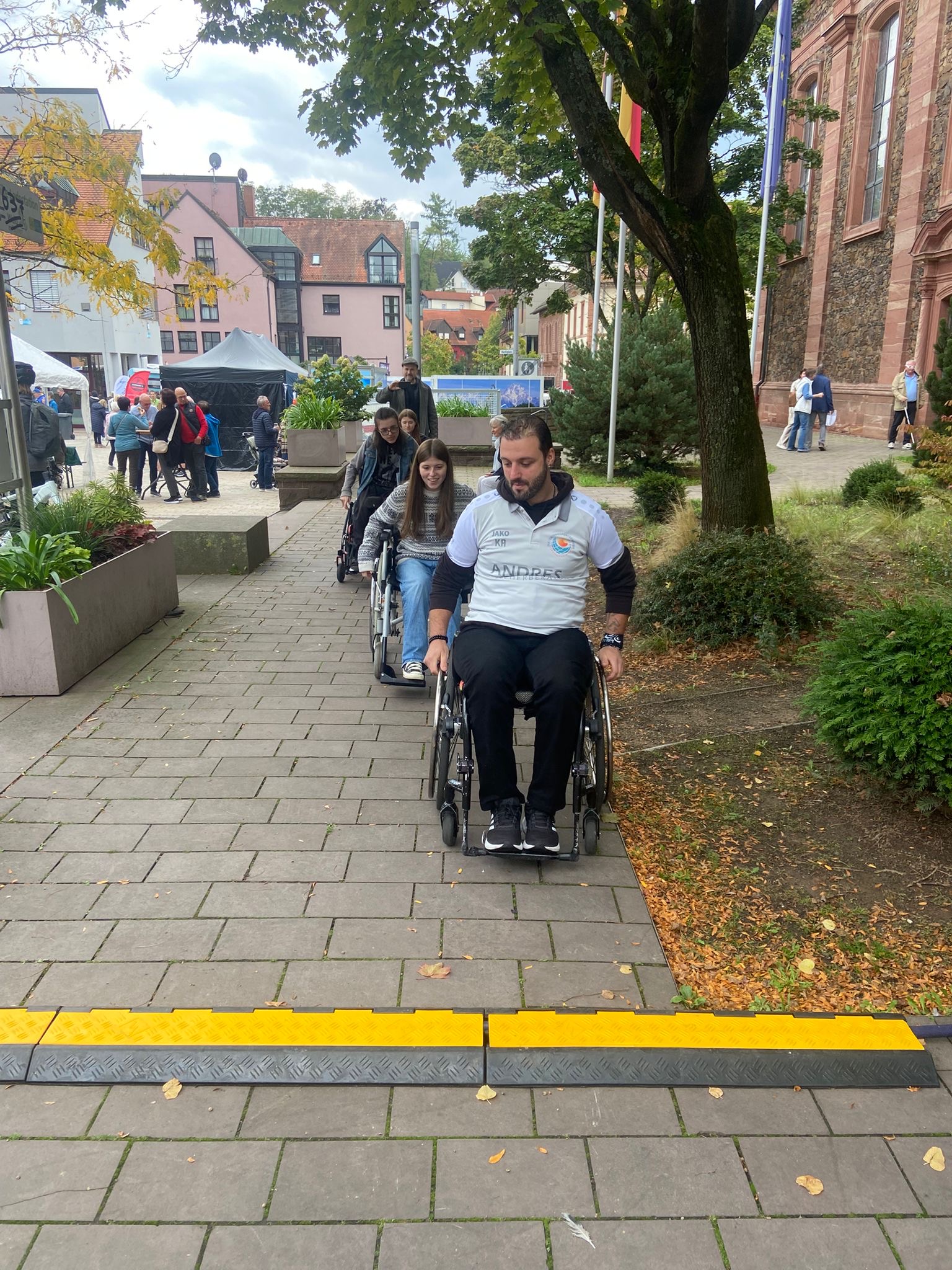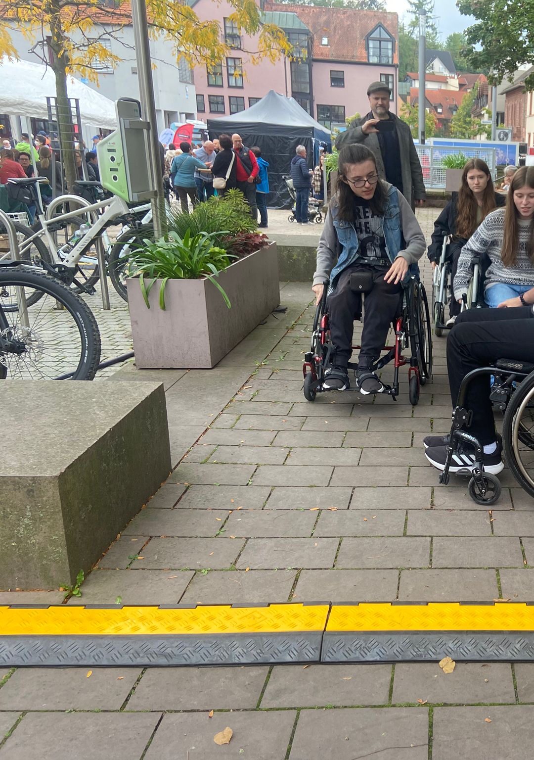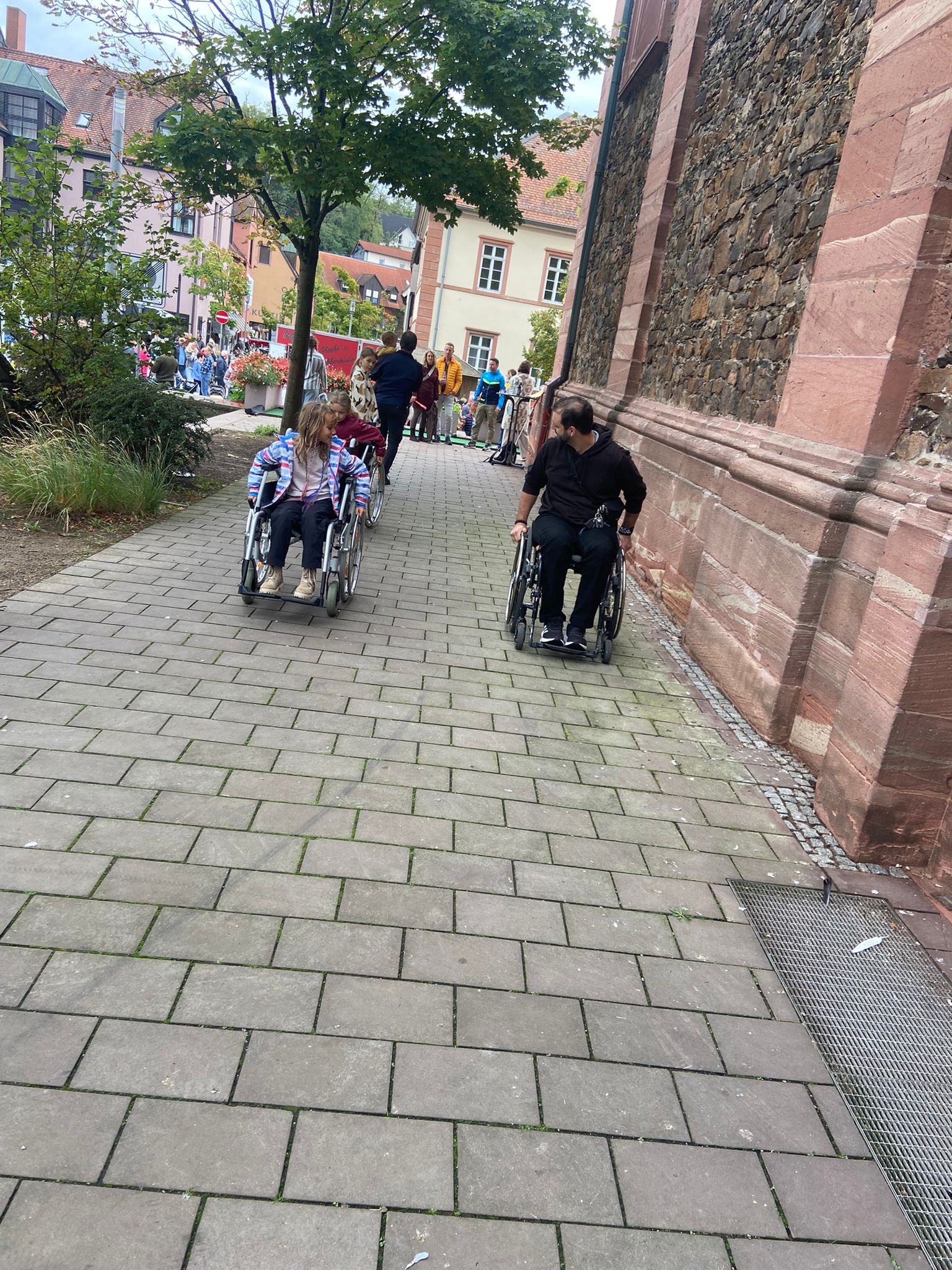 Zusätzlich konnten wir Menschen zeigen, wie es ist, im Rollstuhl kleine Hürden des Alltags zu überwinden: mal bergauf oder bergab, über einen Kabelkanal, Kopfsteinpflaster, durch Menschenmengen oder beim Kippen des Rollstuhls.